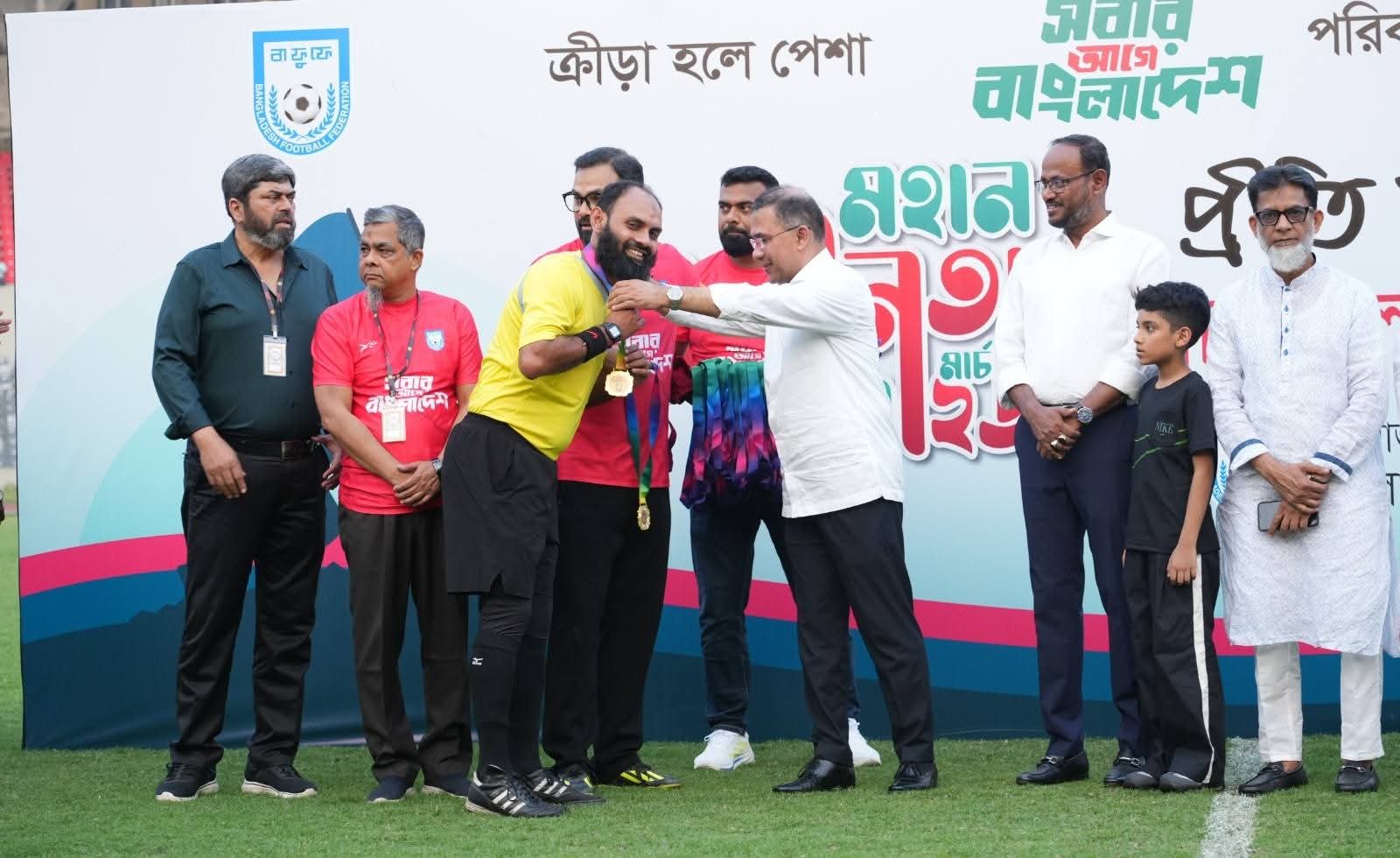 এ সময় প্রধানমন্ত্রীর কন্যা জাইমা রহমান, যুব ও ক্রীড়া প্রতিমন্ত্রী আমিনুল হকসহ ক্রীড়াঙ্গনের বিশিষ্ট ব্যক্তিবর্গ উপস্থিত ছিলেন। বাংলাদেশ ফুটবল ফেডারেশন (বাফুফে) আয়োজিত “স্বাধীনতার চেতনায় ফুটবল উৎসব” শীর্ষক এই ম্যাচে লাল ও সবুজ দল অংশ নেয়, যেখানে সবুজ দল ৩-০ গোলে জয়লাভ করে।